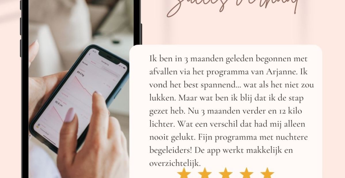 Ik ben in 3 maanden geleden begonnen met afvallen via het programma van Arjanne. Ik vond het best spannend… wat als het niet zou lukken. Maar wat ben ik blij dat ik de stap gezet heb. Nu 3 maanden verder en 12 kilo lichter. Wat een verschil dat had mij alleen nooit gelukt.